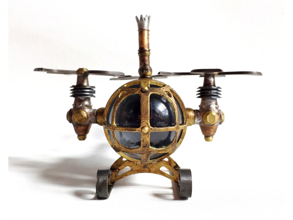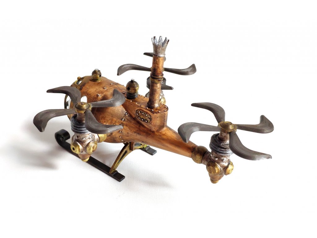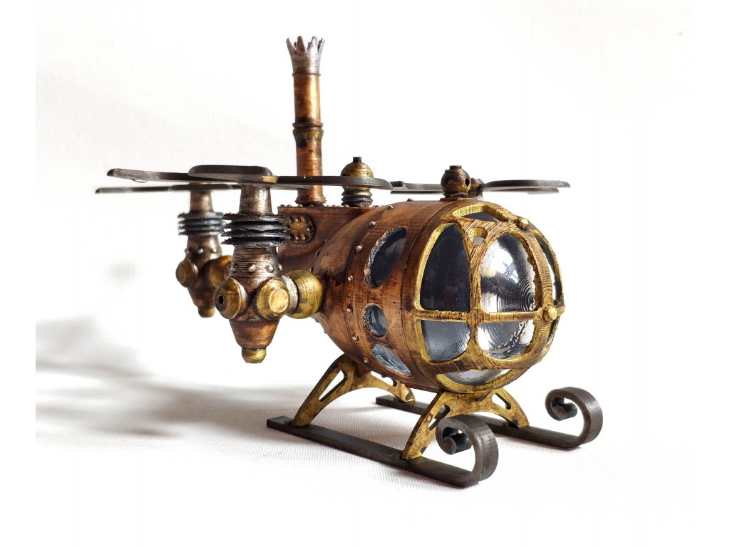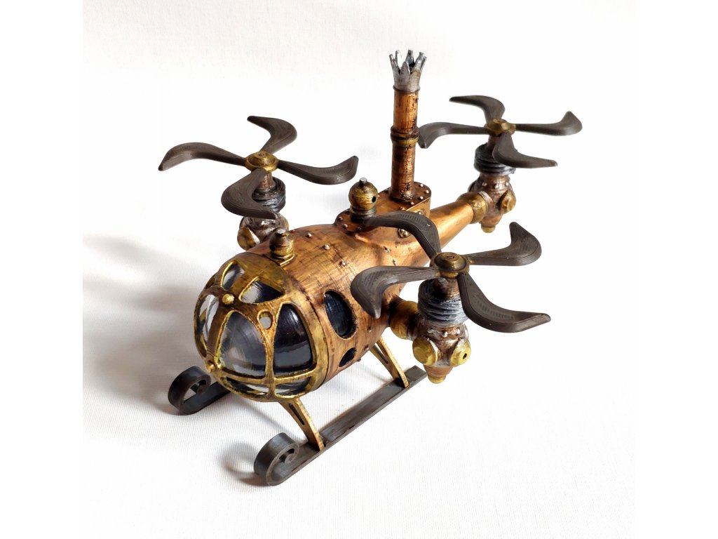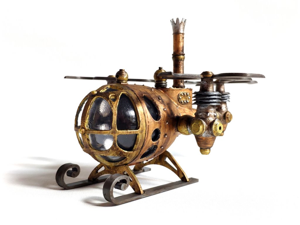 Steampunkový vrtulník byl vytvořen dle naší vlastní fantazie, hodí se jako statická dekorace nebo do fantasy panoramat. Model je vyroben z PLA a transparentní část je z vakuovačky a připomíná sklo. Vrtulník je statický model, tudíž jeho části nejsou pohyblivé.