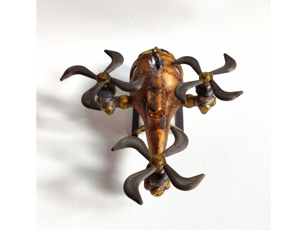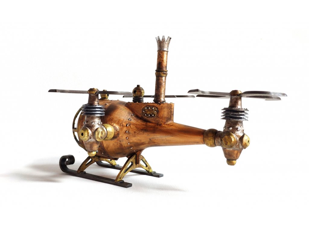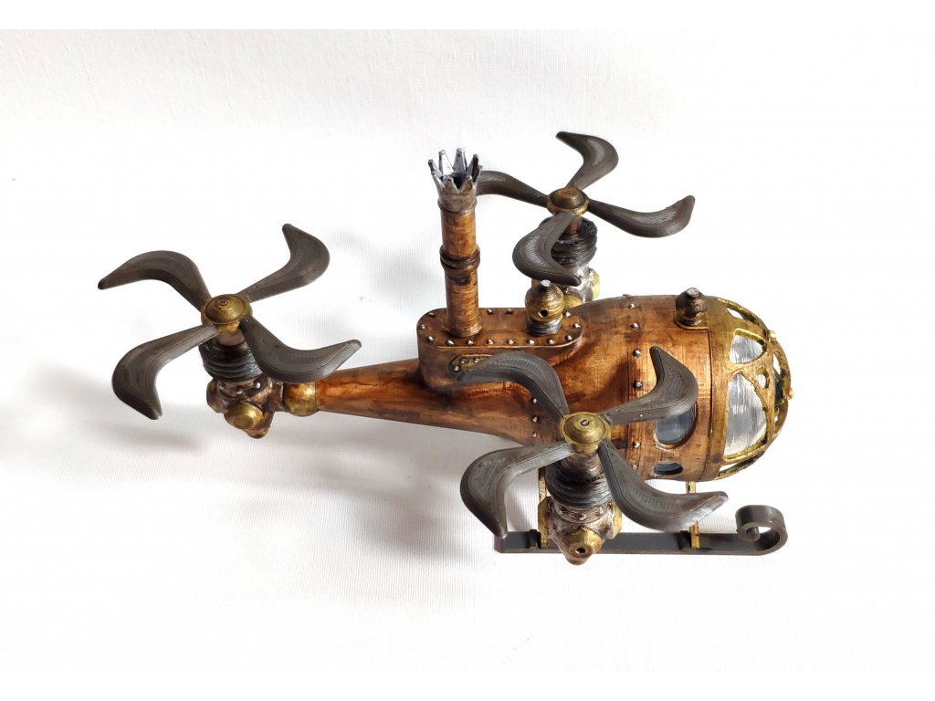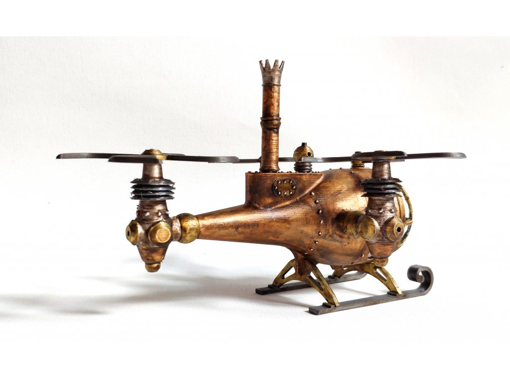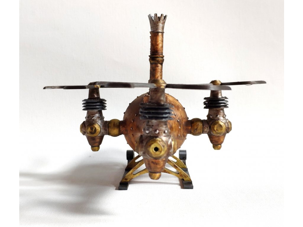 Steampunkový vrtulník byl vytvořen dle naší vlastní fantazie, hodí se jako statická dekorace nebo do fantasy panoramat. Model je vyroben z PLA a transparentní část je z vakuovačky a připomíná sklo. Vrtulník je statický model, tudíž jeho části nejsou pohyblivé.